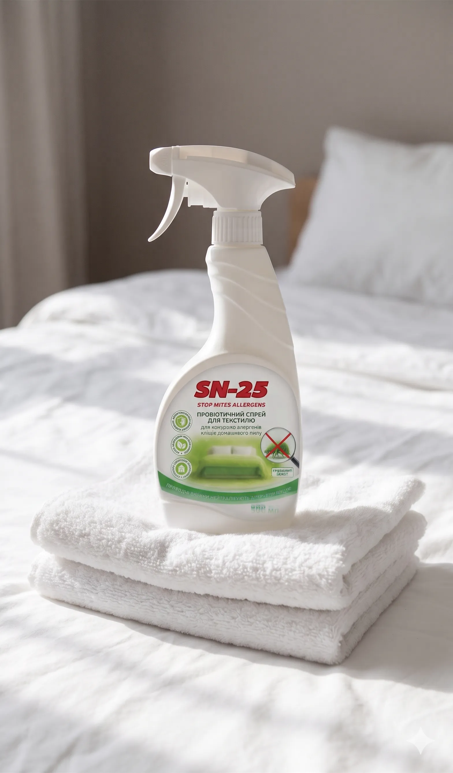 SN-25 STOP MITES ALLERGENS — це пробіотичний спрей для текстилю, який допомагає підтримувати чистоту у вашому домі на щоденній основі.